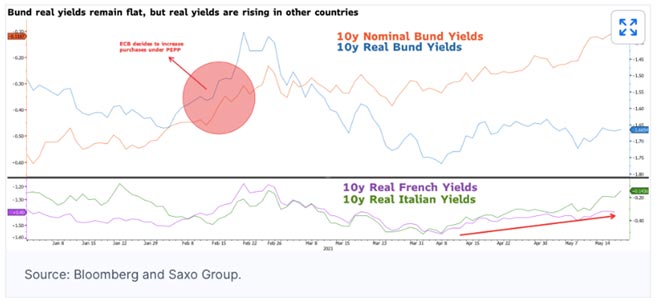 Una delle ragioni principali per cui gli investitori credono che la BCE possa iniziare ad inasprire le condizioni finanziarie dell’area euro è che i tassi reali tedeschi rimangono stabili mentre i rendimenti nominali dei Bund continuano ad aumentare. A febbraio, quando la BCE ha comunicato che avrebbe aumentato gli acquisti nell'ambito del programma PEPP, i rendimenti nominali dei Bund stavano aumentando insieme a quelli reali, inasprendo le condizioni finanziarie. Tuttavia, ora che i rendimenti reali tedeschi sono stabili, i rendimenti reali di altri paesi europei stanno aumentando, inasprendo le condizioni economiche in specifiche aree geografiche. Pertanto, riteniamo che la BCE dovrà continuare a sostenere le condizioni di finanziamento attraverso un ritmo stabile o addirittura aumentando gli acquisti di obbligazioni nell'ambito del programma PEPP per sostenere la ripresa economica in questi paesi.