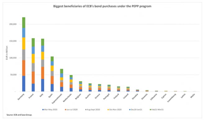 La Francia è anche un beneficiario più significativo degli acquisti di obbligazioni della BCE nell'ambito del programma PEPP rispetto all'Italia, il che la rende ancora più esposta ad un eventuale rischio di tapering.