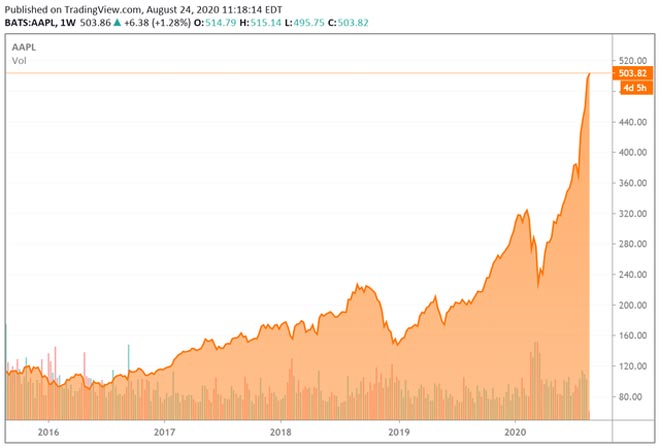 Considera il prezzo delle azioni. Le azioni Apple sono aumentate di circa 4,6 volte negli ultimi cinque anni