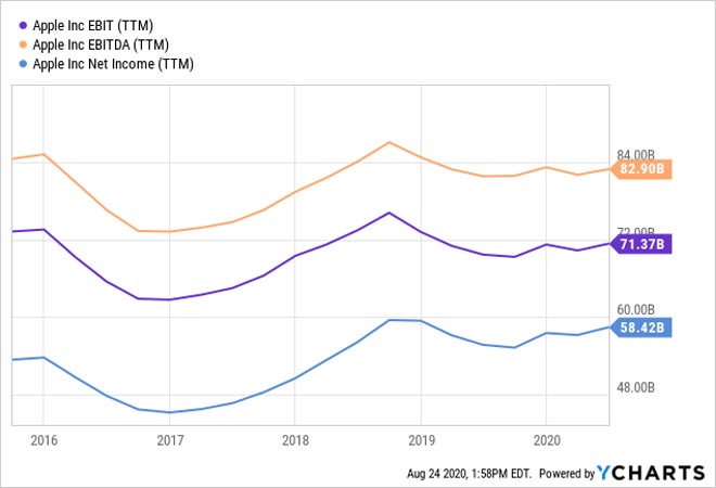 Dal 2015, né l'EBIT né l'EBITDA sono aumentati in Apple. I profitti netti sono aumentati principalmente a causa della riduzione delle tasse. I ricavi (non riportati), invece, sono in aumento (anche se non fortemente). Anche l'EPS è in aumento sia perché i profitti netti sono aumentati leggermente, sia per il riacquisto in corso.