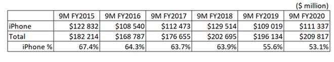Un'altra cosa che è diminuita da allora è, ovviamente, il peso dell'iPhone sui ricavi di Apple.