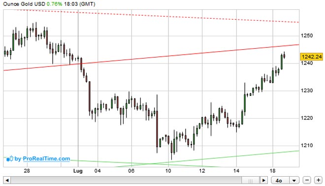 Nel momento in cui scriviamo l'ORO si trova a 1.242,50 dollari l'oncia in rialzo dello 0,70%.