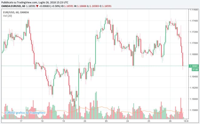 Nel momento in cui scriviamo il cambio eur/usd si trova a 1,1662 in ribasso dello 0,54%.