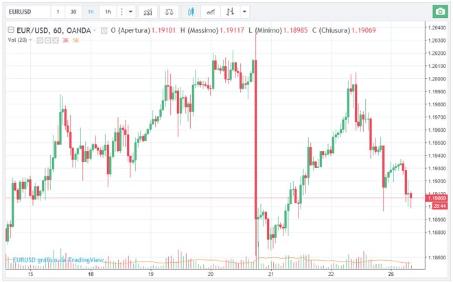 Il cambio euro/dollaro nel momento in cui scriviamo si trova a 1,19061 in ribasso dello 0,38%.