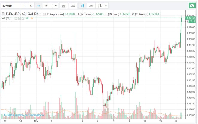 Mattinata in rialzo per il cambio euro/dollaro che negli ultimi minuti si è portato sopra quota 1,1710. È la prima volta che nel mese di novembre la moneta unica supera questo livello psicologico importante.