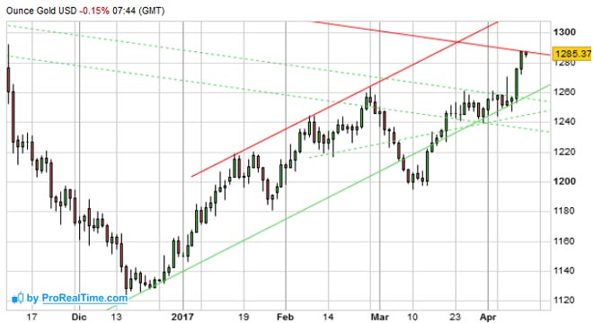 L'attacco militare degli Stati Uniti contro Siria e Corea del Nord e le elezioni presidenziali francesi, stanno spingendo gli investitori verso asset meno rischiosi. Ne pagano le conseguenze i mercati azionari e nello stesso tempo si apprezzano gli asset rifugio come lo YEN e, come detto i metalli preziosi.