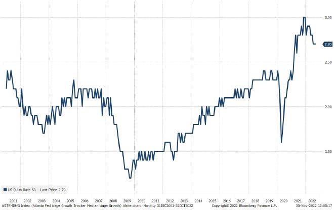 Ad oggi, il tasso di dimissioni negli Stati Uniti, ovvero il numero di persone nel mercato del lavoro che abbandona volontariamente il proprio lavoro, è a livelli molto elevati, suggerendo un fatturato annualizzato nel mercato del lavoro statunitense pari a circa il 30%. Inoltre, chi si dimette e cambia lavoro negli Stati Uniti ottiene il doppio dell'attuale crescita salariale per un valore di circa il 6,5%. Di conseguenza, la pressione sulle imprese in questo momento è significativa. Le dinamiche di pressione salariale e il loro impatto sul margine di profitto netto sono il fattore chiave alla base della nostra visione negativa sugli utili del prossimo anno: alcune imprese, infatti, avranno difficoltà a compensare la compressione del margine derivante dai salari nel momento in cui l'economia sta rallentando.