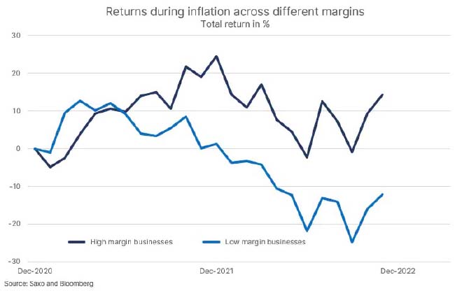 Da quando l'inflazione ha iniziato ad accelerare all'inizio del 2021, le società a basso margine operativo hanno visto una notevole sottoperformance rispetto a quelle ad alto margine. Da allora, il mercato evidenzia la stretta relazione che c’è tra le prime e le continue pressioni salariali.