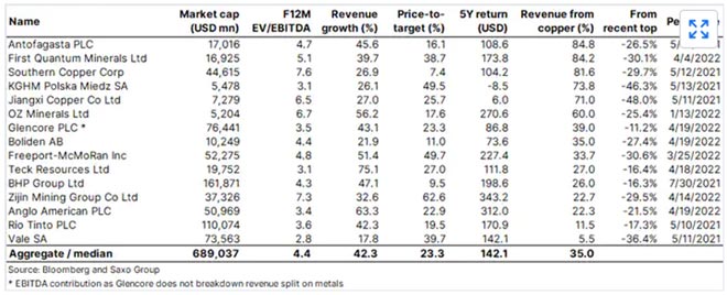 La tabella seguente evidenzia alcune delle principali società minerarie coinvolte nella produzione di rame. I primi sei traggono oltre il 60% dei loro ricavi da questo metallo e la recente correzione, guidata dalla debolezza generale del mercato azionario e dal calo dei prezzi del rame, ha visto questi titoli scendere tra il 25% e il 48%.