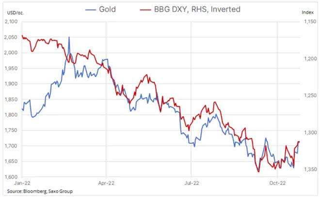 L'oro normalmente trae la maggior parte del suo orientamento direzionale dai movimenti del dollaro e dai rendimenti dei Treasury, cosa che aiuta a spiegare la performance relativamente scarsa di quest'anno in cui il metallo è stato contro il dollaro più alto e il balzo dei rendimenti degli ultimi decenni.