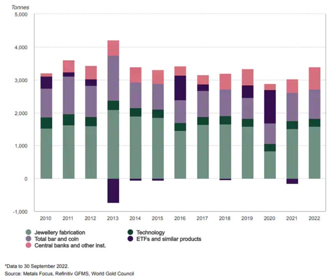 Di recente, tuttavia, l'attenzione si è spostata sempre più sul dollaro, come evidenziato dalla forte correlazione tra l'ampio indice Bloomberg Dollar e l'oro nel grafico sopra. A supportare il miglioramento di fondo del sentiment è stato l'aggiornamento Gold Demand Trends Q3 2022 del World Gold Council in cui si è registrata la domanda delle banche centrali che hanno raggiunto un record trimestrale di quasi 400 tonnellate, compensando così un deflusso di 227 tonnellate dagli ETF. Nel complesso, la domanda da inizio anno è aumentata del 18% rispetto allo stesso periodo del 2021, tornando ai livelli pre-pandemia.