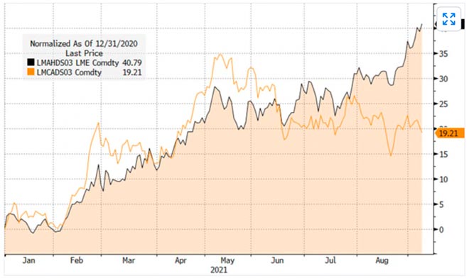Dopo essersi mossi in maniera simile durante il primo periodo del 2020, le decisioni della Cina hanno provocato negli ultimi mesi la fine del rally del rame. Viceversa l'alluminio ha continuato a salire sulle preoccupazioni di approvvigionamento menzionate.