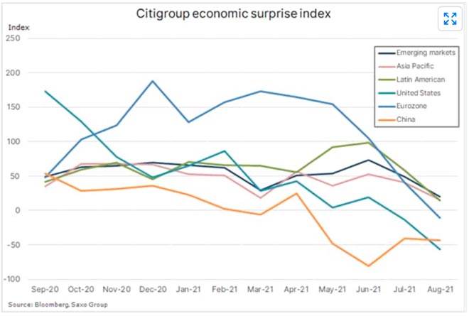Oltre a queste misure per frenare i prezzi e l'interesse speculativo, il rame ha anche risentito dell'impatto della crescita che ha iniziato a raffreddarsi nel terzo trimestre, quando le spese di stimolo e l'esplosione dell'attività alimentata dalla riapertura hanno rallentato sia negli Stati Uniti che in Cina. La crescita del terzo trimestre negli Stati Uniti è stata rivista nettamente al ribasso, con una banca statunitense che prevede una crescita zero, mentre un'altra ha dimezzato le sue previsioni dal 6,5% al 2,9%. Secondo l'indice di sorpresa economica di Citigroup, i dati recenti di tutto il mondo sono stati in generale inferiori alle aspettative, sostenendo così l'opinione che la crescita potrebbe rallentare mentre l'inflazione sembra ancora tutt'altro che transitoria.