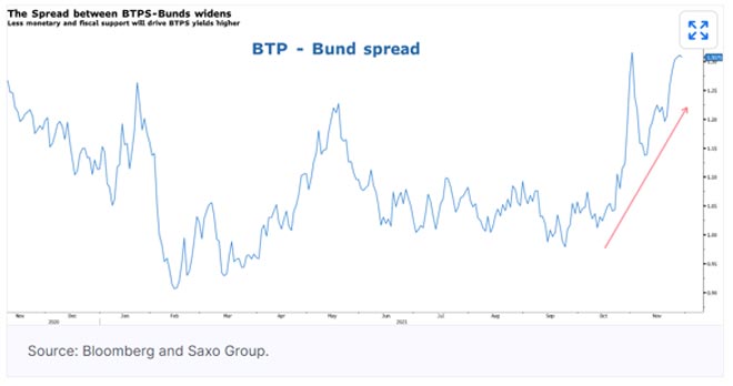 Si stanno attenuando i timori di una variante Covid più contagiosa e più letale e già stamattina si vedono i rendimenti europei aumentare leggermente. Tuttavia, i titoli di stato rimangono sostenuti dall'ipotesi di una BCE accomodante. Riteniamo che i rendimenti obbligazionari europei siano pronti ad aumentare una volta eliminate le distorsioni dovute al Covid. Le pressioni inflazionistiche continuano, infatti, ad aumentare, rendendo più difficile per la BCE giustificare politiche di sostegno. Questa mattina, i prezzi alla produzione per l'Italia sono saliti a un record del 7,1% mensile (20,4% YoY) e i dati sull'IPC dell'Eurozona di domani dovrebbero salire al 4,5%. I titoli di stato della periferia sono più vulnerabili alla mancanza di sostegno monetario e fiscale in un contesto di elevata inflazione. Pertanto, i BTPS italiani sono tornati a fuoco in mezzo a una nuova ondata di coronavirus.