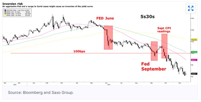 Indipendentemente da come si svilupperanno le cose riguardo alla variante Omicron, il mercato sembra concordare sul fatto che il rally obbligazionario della scorsa settimana sia stato esagerato. La curva dei rendimenti stamattina è in rialzo ribassista con i rendimenti a 10 anni tornati sopra l'1,5%. Tuttavia, lo spread tra i rendimenti 5s30s rimane il più piatto da febbraio dello scorso anno.