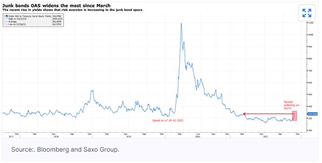 Continuiamo a intravedere lo spazio per un appiattimento della curva dei rendimenti USA per tutto l'inverno. Una nuova ondata di coronavirus potrebbe persino portare a un'inversione, poiché il mercato dovrà riconsiderare la crescita economica futura. Tuttavia, escludiamo che la Federal Reserve si allontanerà dalla sua posizione da falco, date le pressioni inflazionistiche costantemente elevate. In Europa i tassi restano sotto controllo tra le distorsioni del Covid. Tuttavia, ci aspettiamo che aumentino non appena i timori riguardanti il ceppo di omicron si attenuano. La periferia soffrirà della mancanza di supporto monetario e fiscale in un contesto di elevata inflazione, con il BTPS che ne risentirà maggiormente. Nel frattempo, gli spread del credito obbligazionario spazzatura si stanno allargando a causa dell'aumento della volatilità del mercato e dei tassi d’interesse, segno che gli investitori stanno diventando sempre più avversi al rischio.