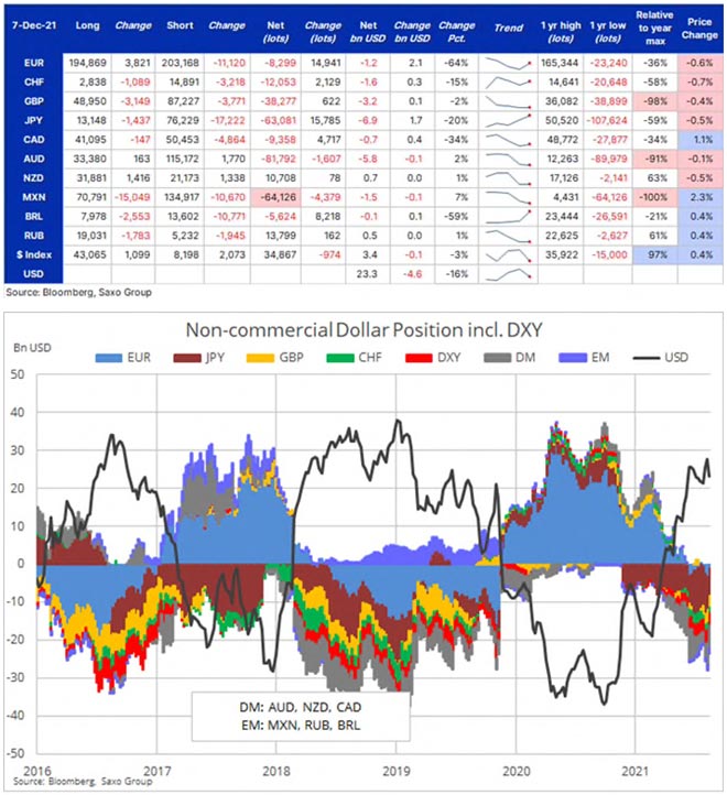 Guardando a tutte le asset class coperte in questo aggiornamento notiamo che la squadratura delle posizioni sta diventando un tema importante. Dicembre è normalmente un periodo dell'anno in cui i trader riducono l'esposizione in quanto la liquidità inizia a prosciugarsi e i book di negoziazione vengono ridotti in vista delle vacanze e della fine dell'anno. Tenendo in mente questo scenario, le giornate di scambi particolarmente frenetiche potrebbero non dare molte indicazioni sulla direzione a breve termine del mercato. Ne sono un esempio le riduzioni delle posizioni lunghe su dollaro e materie prime, avvenute in una settimana in cui entrambe sono aumentate.