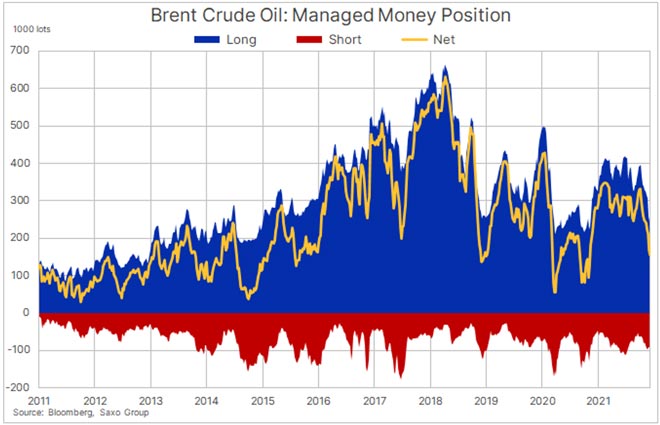 Energia: Il più interessante dei cambiamenti della scorsa settimana è stata la riduzione di 13.1k lotti nel long del greggio Brent ad un nuovo minimo di 13 mesi a 154k lotti. Si è assistito ad una vendita ininterrotta nelle ultime nove settimane e, nonostante il rally del 9% della scorsa settimana, il recupero dovuto all’avvento della variante Covid Omicron e la rottura sopra la media mobile a 200 giorni, gli speculatori non hanno cambiato la loro posizione difensiva. Un comportamento che è in netto contrasto con la convinzione generale del mercato di un aumento dei prezzi nel 2022.