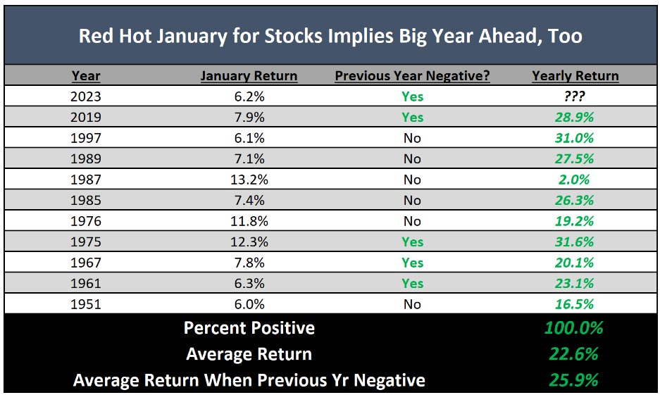 Se sei preoccupato che l’ottima performance di gennaio del mercato azionario sia stata solo un altro rally di un mercato ribassista, non preoccuparti, secondo i risultati storici, ed escludendo un evento del ‘cigno nero’, la storia dice che ci sono ottime possibilità che questo sia l’inizio di un grande breakout del mercato azionario che duri almeno per il resto dell’anno.