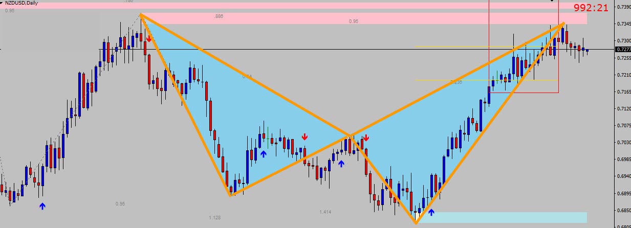 Analizzando lo scenario giornaliero della coppia che vede contrapposto il Dollaro neozelandese (NZD) ed il green back, in gergo chiamato “kiwi”, è stata individuata una bearish shark, la quale ha ultimato l’ultimo movimento nel punto “D” ed esattamente 0,7340, nonché area di supply (fascia rosa), zona dove in passato già è stata interessata ed esattamente dal massimo raggiunto il 07 febbraio di quest’anno.