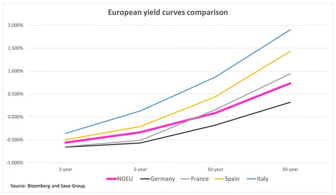 Una ricerca di Goldman Sachs sottolinea che uno dei rischi alla base delle obbligazioni NGEU è la mancanza di protezione da scenari estremi come una rottura della zona euro. Tuttavia, ora che l'UE sta facendo importanti passi in avanti verso una migliore integrazione europea, sembra che questo scenario sia improbabile. Ad ogni modo, i titoli di stato francesi, nella parte anteriore della curva dei rendimenti, sembrano essere una distorsione del mercato provocata dalle politiche della BCE. Proprio per lo stesso motivo, i rendimenti dei titoli di stato greci sono ora inferiori a quelli dell'Italia.