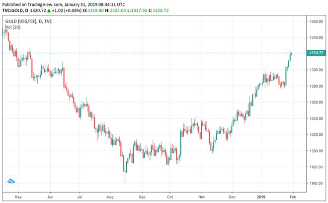 L'oro è stato un chiaro vincitore di una Fed più paziente, il metallo prezioso è salito a 1.323 dollari, massimo da 8 mesi durante la notte e facendo ipotizzare un proseguimento rialzista nel breve periodo.