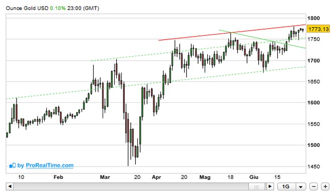 L'analista ed esperto in materia Carlo Alberto De Casa (Qui puoi leggere il suo ebook I segreti per investire con l’oro) conferma che lo scenario a lungo termine rimane favorevole al lingotto poiché l’incertezza persiste per via dei timori di una seconda ondata di Covid-19. Dal punto di vista tecnico, l'analista, vede il prezzo dell'oro in una fase di consolidamento, con livelli di supporto posizionati a $ 1.763 e $ 1.745, mentre una chiara rottura al di sopra di $ 1.780 farebbe spazio ad ulteriori rialzi.