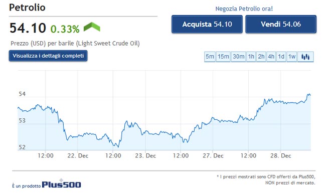 Durante le giornata di trading di ieri, il prezzo del petrolio ha aumentato il suo valore da 53,26 a 53,86 dollari per barile. Questa mattina il future sul petrolio si trova sopra quota 54 dollari.