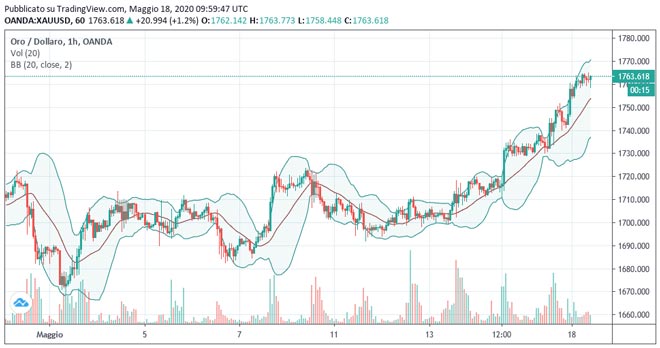 Questa mattina il metallo giallo ha segnato un massimo a 1.764,8 dollari prolungando la sua recente mossa positiva della settimana scorsa ed è sostenuto dall'incertezza nella mancanza di una cura adeguata al coronavirus, alle difficoltà di valutare il danno economico e sopratutto per il peggioramento delle relazioni USA-Cina.
