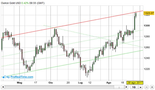 Il metallo prezioso è sopportato dalle tensioni geopolitiche tra Stati Uniti e Corea del Nord e il cola del dollaro debole dopo il discorso della Presidente della Federal Reserve Janet Yellen a Jackson Hole.