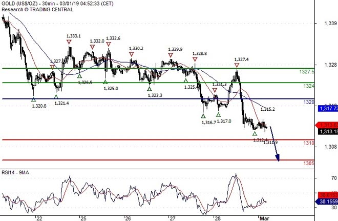 Nel momento in cui scriviamo il prezzo dell'oro si trova in prossimità dei 1.310 dollari l'oncia. La rottura di questo livello di supporto potrebbe causare un discesa del metallo prezioso fino a quota 1.305 e successivamente a 1.300 dollari.