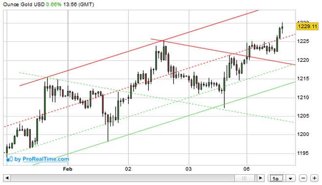 Se il prezzo dell'oro dovesse dovesse continuare a crescere rompendo il livello di resistenza a 1.230 dollari, il prossimo livello importante è a 1.239 dollari l'oncia.