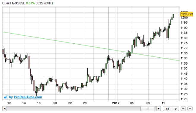 Il prezzo dell’Oro vola sui massimi delle ultime 6 settimane con i prezzi, nel momento in cui scriviamo, sopra ai 1.200 dollari l'oncia.