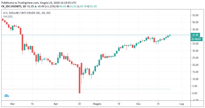 Continua la corsa del petrolio che vede salire i suoi prezzi sui massimi degli ultimi tre mesi sopra la soglia dei 41 dollari. Al momento della stampa, il prezzo del WTI si trova a 41,06 dollari in rialzo dello 0,92%, invertendo leggermente il livello massimo giornaliero di 41,61 dollari.