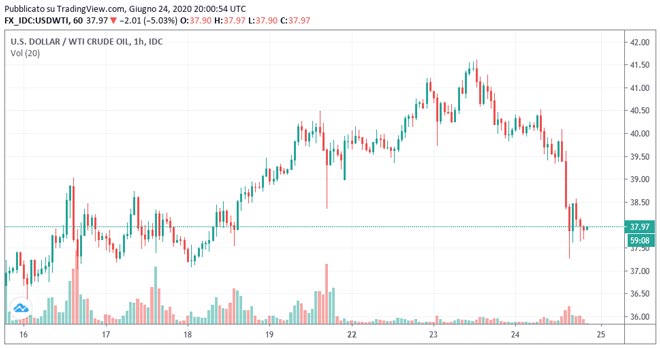 Nel momento della scrittura il prezzo del petrolio WTI è in calo del 5,10% a 37,96 dollari in scia con la performance negativa dei mercati finanziari globali.