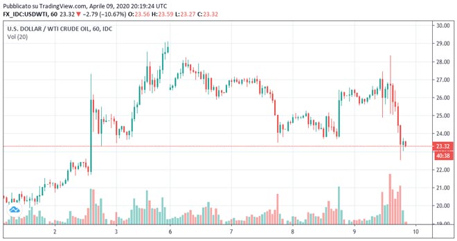 Giornata altalenante per il petrolio dopo aver registrato un'impennata dei prezzi fino a 28,30 dollari, ha invertito completamente la rotta assestandosi poco sopra ai 23 dollari al barile, segnando un calo del 10%.