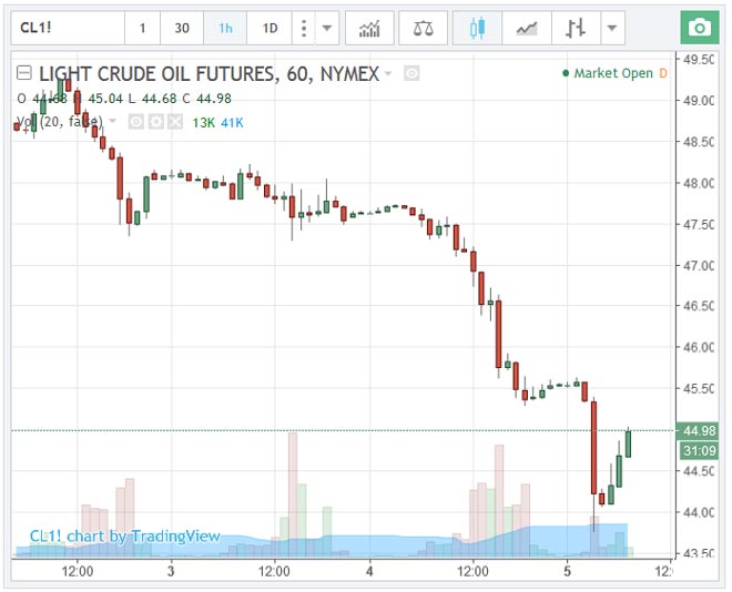 Questa mattina il prezzo del petrolio è sceso sotto i 44 dollari al barile per poi rimbalzare nelle ultime ore raggiungendo negli ultimi minuti quota 45 dollari.