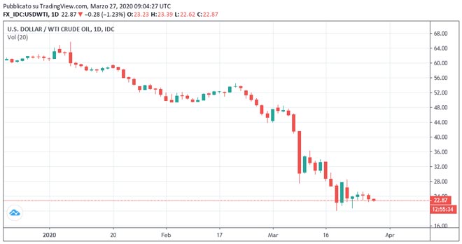 I prezzi del petrolio continuano a scendere nell'ultimo giorno di contrattazioni dalla settimana. Nel momento della pubblicazione il prezzo del petrolio WTI segna un ribasso dell'1,86% a 22,74 dollari.
