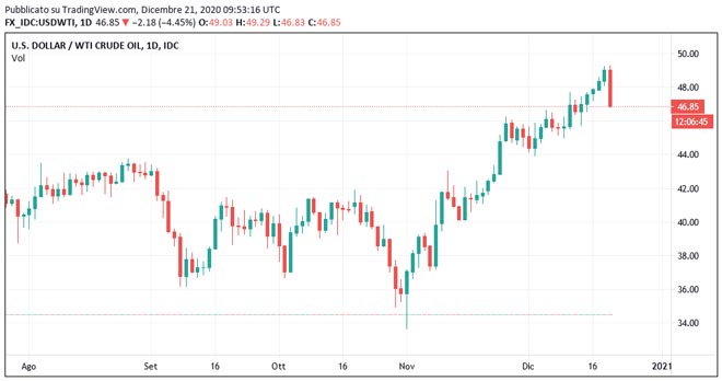 Nel momento della scrittura, il prezzo del petrolio WTI è in calo del 5% a 46,76 dollari al barile (minimo intraday).