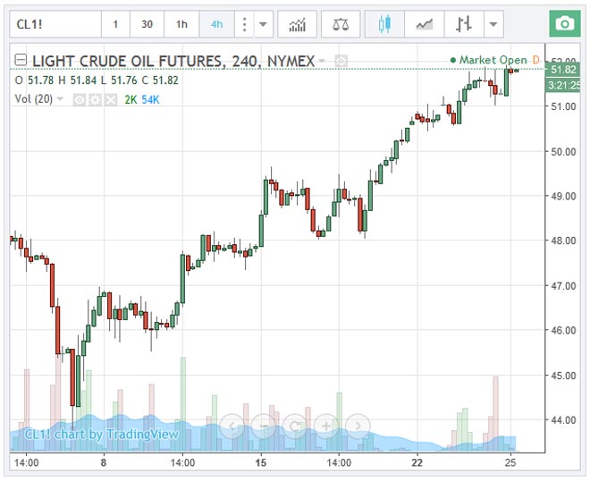 Nel momento in cui scriviamo il prezzo del petrolio si trova a 51,74 dollari al barile con un rialzo dello 0,70%.