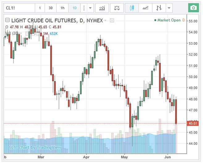 Nel momento in cui scriviamo il prezzo del petrolio si trova a 45,84 dollari al barile in ribasso del 4,93%.