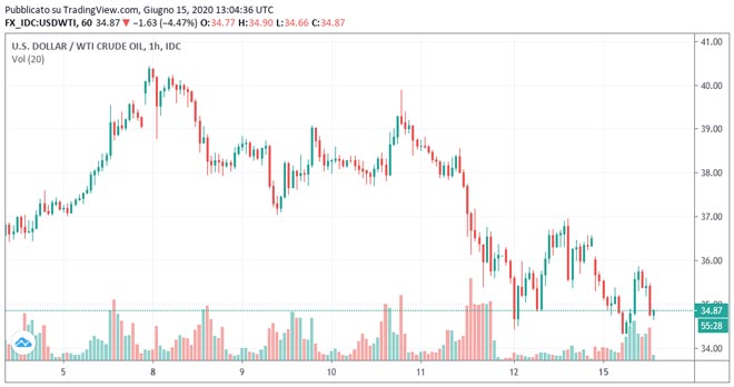 Il petrolio WTI inizia la settimana in territorio negativo proseguendo la tendenza avviata la scorsa settimana. Nel momento della scrittura il prezzo del petrolio è in calo del 4% a 34,70 dollari.
