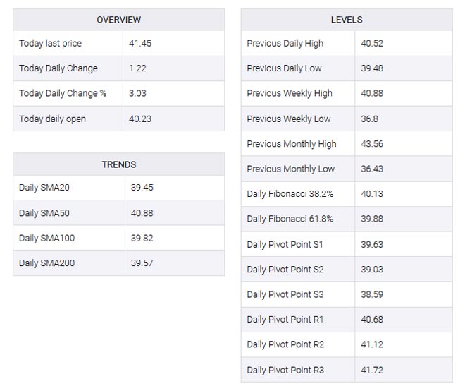 Il prezzo del petrolio WTI continua a salire andando ha chiudere i primi quattro giorni della settimana in territorio positivo toccando il livello più alto dal 13 settembre a 41,30 dollari al barile. Al momento della scrittura, il petrolio WTI registra un rialzo del 3,28% a 41,24 dollari.