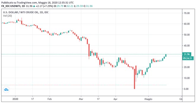 È un inizio di settimana positivo per il petrolio che si appresta a registrare il quinto giorno consecutivo in rialzo e raggiungere un nuovo massimo delle ultime nove settimane oltre i 32 dollari. Al momento della stesura di questo articolo, la prezzo del petrolio WTI è scambiato intorno ai 31,96 dollari, in guadagno di oltre 8 punti percentuale su base giornaliera.