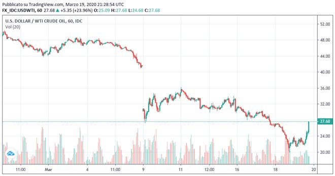 I prezzi del petrolio WTI sono in forte aumento questo giovedì anche se ancora sufficiente per cancellare le perdite del giorno precedente. Al momento della scrittura il petrolio WTI è scambiato a 25,64 dollari per barile con un rialzo del 25% su base giornaliera.