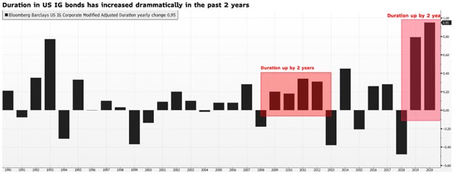 La riunione del FOMC della scorsa settimana e la caduta dei Treasurys rafforzano la nostra convinzione che stiamo assistendo ad un duration event. In questo contesto, il mercato delle obbligazioni societarie investment-grade crolla più velocemente dei titoli junk a causa della sua più elevata sensibilità ad un aumento dei tassi d’interesse. Ciò è dovuto al fatto che la duration di questi titoli è molto alta rispetto a quella di titoli con un rating inferiore. Infatti, mentre la durata media dei titoli junk è di circa tre anni e mezzo, lo spazio obbligazionario investment-grade è caratterizzato da una durata di oltre 8 anni. La durata dei crediti IG è aumentata di un anno e mezzo negli ultimi due anni. Per contestualizzare: ci sono voluti quattro anni dopo la crisi finanziaria globale perché la durata raggiungesse questo valore.
