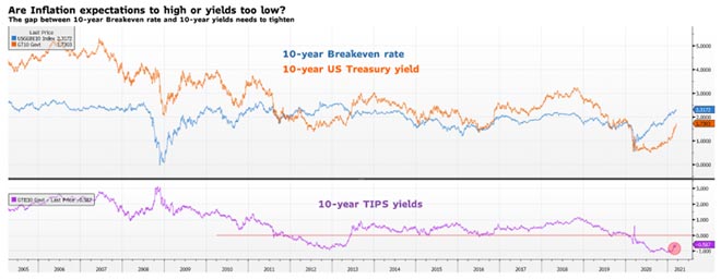 Il mercato considera rendimenti a 10 anni al 2% ma, se la Federal Reserve non agirà, potrebbero aumentare molto di più. La Fed è stata in grado di garantire condizioni finanziarie favorevoli mantenendo i tassi d’interesse reali negativi. Bisogna, però, ricordare che non rimarranno negativi per sempre e in circostanze normali, i rendimenti nominali dovrebbero superare il tasso breakeven. Questo significa che se le aspettative di inflazione continueranno a salire, vedremo inevitabilmente i rendimenti a 10 anni salire al di sopra del 2,3%.