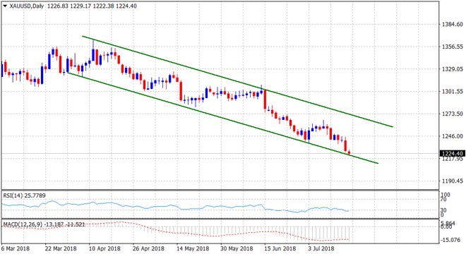 Se il metallo prezioso dovesse continuare a scendere superando il livello di supporto a 1.218 dollari, cercherà di raggiungere il prossimo supporto a 1.212 e in caso di ulteriore rottura, il trend al ribasso continuerà verso 1.200 dollari l'oncia.