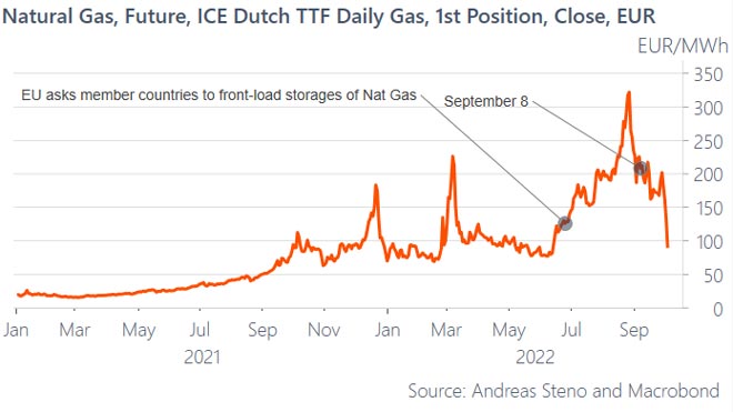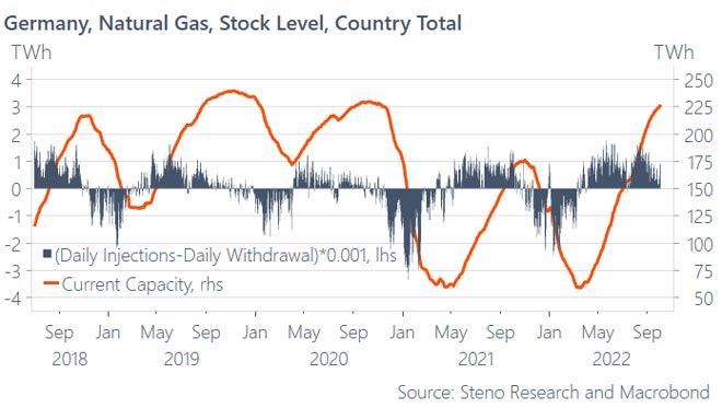 Secondo Larsen, la richiesta dell'Unione Europea ai suoi Stati membri di riempire le loro riserve di gas avrebbe potuto potenzialmente aiutare la rincorsa dei prezzi del gas. Ora che la maggior parte dei paesi, ad eccezione dell'Ungheria, è riuscita a rifornire circa l'80% della propria capacità di gas naturale, l'azione sui prezzi si sta invertendo.
