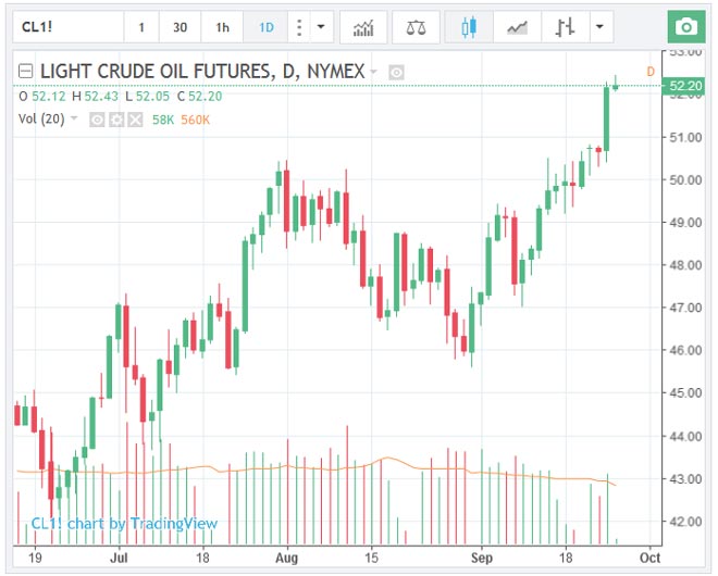 Prosegue il rialzo del prezzo del petrolio che in una sola giornata sale di 2 dollari al barile raggiungendo i massimi degli ultimi mesi a 52,43 dollari.